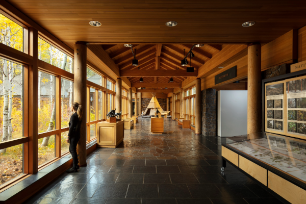 The following images show where the new art installation will be situated. It will replace the tule reed tipi at the entrance of the new exhibition and could be situated along one or multiple walls and/or the ceiling depending on the selected artist’s concept. Hover over an image to zoom in.