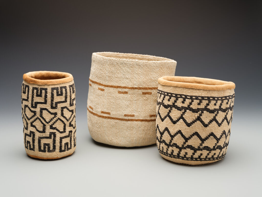 Image credit (left to right): Joe Feddersen (b. 1953, Confederated Tribes of the Colville Reservation): Wild Cat, 2009, waxed linen and brain tanned deer hide, 6 ½ x 4 x 4 in. (16.5 x 10.2 x 10.2 cm); Turn Lane, 2018, waxed linen, bias tape, and thread, 8 x 7 x 7 in. (20.3 x 17.8 x 17.8 cm); Wintermaster Plus, 2012, waxed linen and brain tanned deer hide, 6 x 6 x 6 in. (15.2 x 15.2 x 15.2 cm). Collection of the artist; courtesy studio e gallery, Seattle, Washington. Photograph by Dean Davis. © Joe Feddersen
