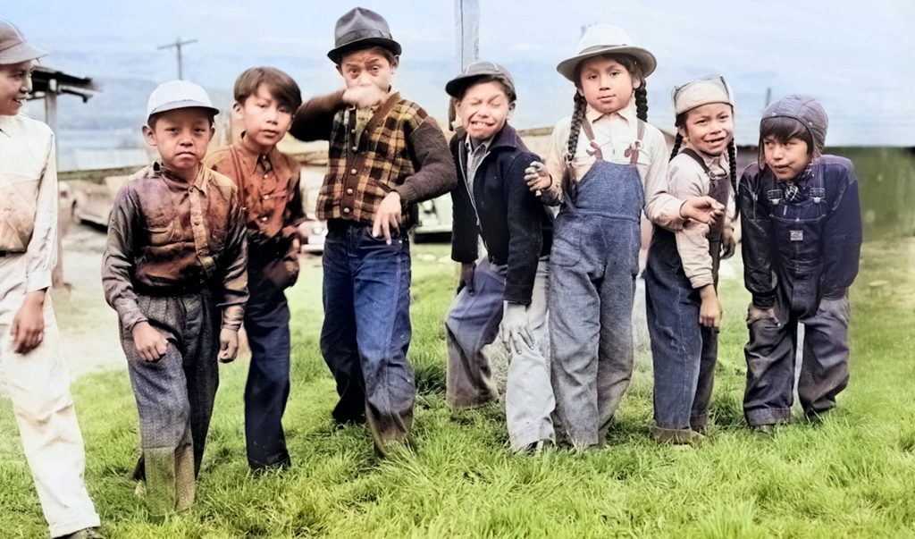 Children at Celilo Village in 1940 including (left to right) Unidentified, Dewey Canapoo, Nelson Billy, Wallace Albert, Tommy Eli, Buster George, Cecil Billy, and Russell Billy. Photograph by Everett Olmstead. Photo courtesy of Historic Photo Archive. Colorized by the High Desert Museum.