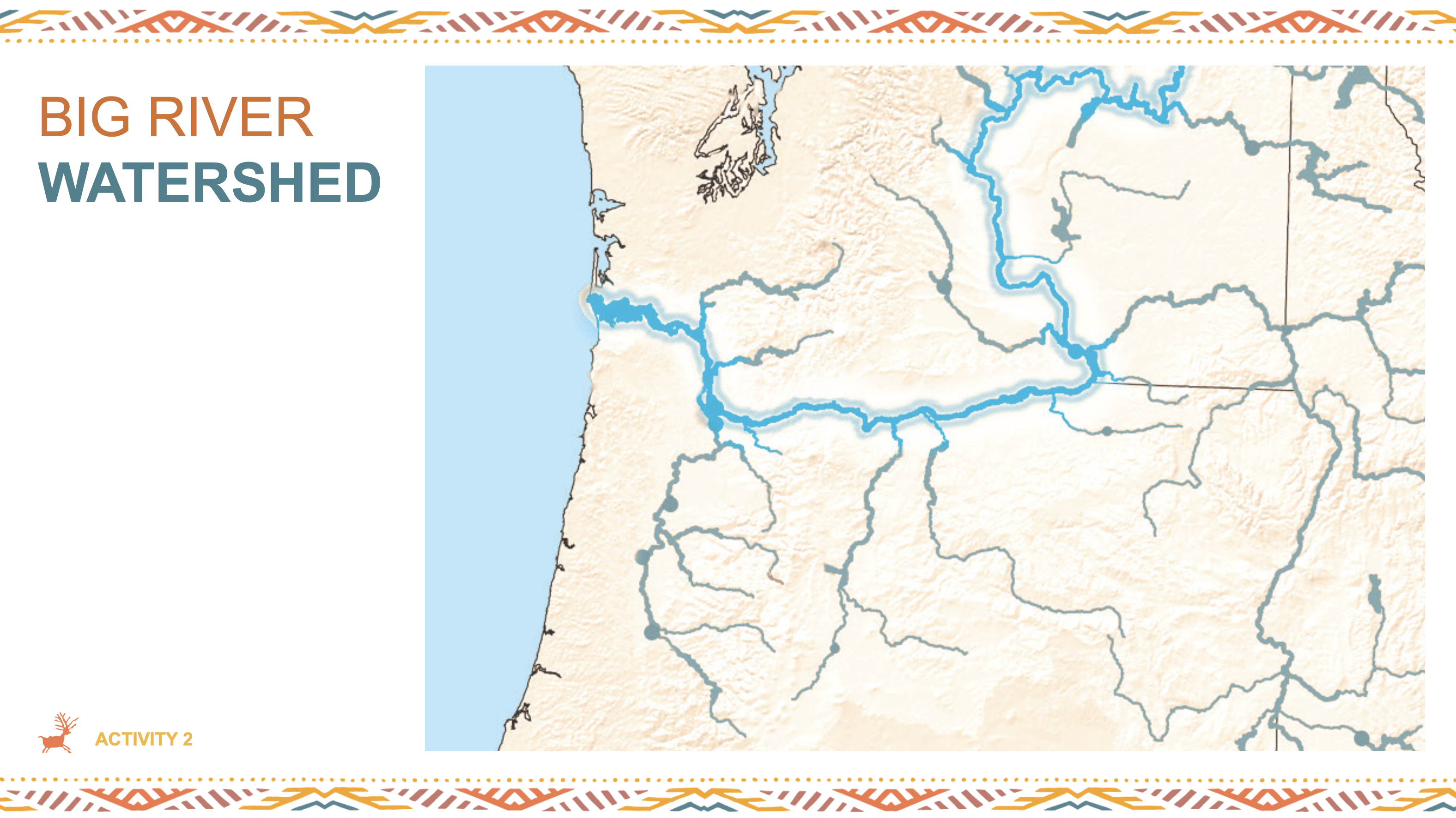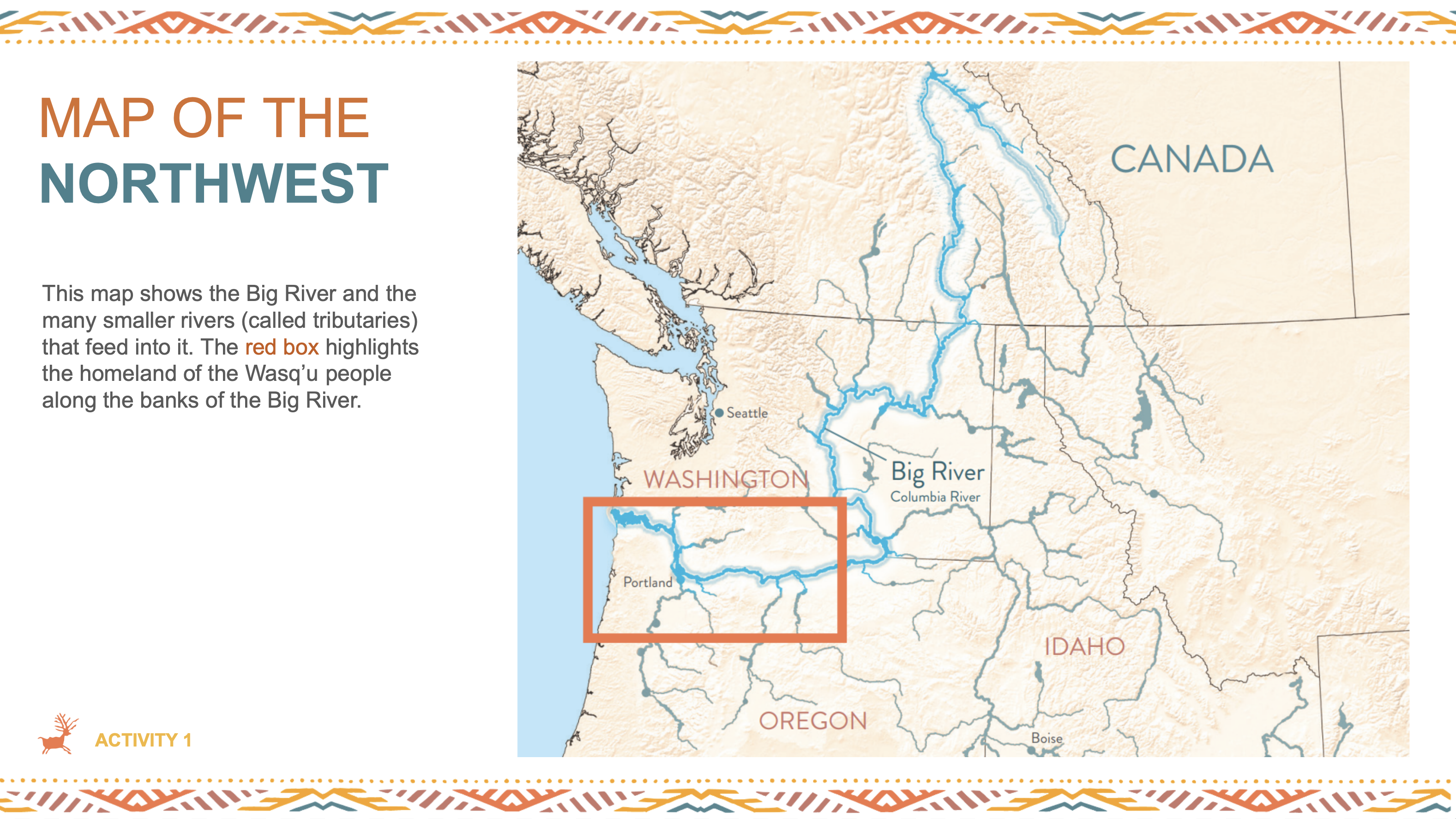 In the first activity, students reflect on a personally meaningful place and compare it to the significance of the Big River to the Wasq’u. In the second lesson, they use maps to connect parts of the landscape to key aspects of Wasq’u culture. The third lesson immerses students in a trading simulation, helping them explore why the Wasq’u homeland along the River has been a central hub for trade and cultural exchange in the Northwest. The fourth activity highlights the ongoing efforts of the Wasq’u to care for the River, encouraging students to consider how they, too, can care for the places they live.